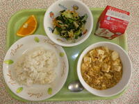 いそか和えは、細く切ったキャベツやほうれん草や人参を入れたあえ物です。細かく切った刻みのりを加えることで、磯の匂いがほんのり香るように工夫しました。マーボー豆腐には、豚ひき肉と刻んだ大豆、たけのこ、しいたけなどを入れました。食欲が増すようにニンニクやショウガを入れました。ほうれん草は隣の畑産です。人参、ネギは千葉産です。