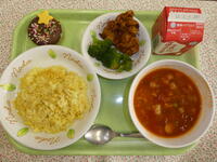 今日は、今年最後の給食でした。ほんのりカレー味のごはんとニンニクで下味をつけたフライドチキン、鰹節と醤油で味付けした和風のブロッコリー、小さく切った野菜とウインナーと大豆と星形のマカロニを入れたミネストローネスープ、ドーナツにチョコレートとカラフルシュガーをちらしたクリスマスリースケーキのクリスマスバージョン献立でした。玉ねぎ、じゃが芋は隣の畑産です。人参は千葉産です。