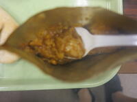 今日は、おはなし給食13日目です。今日のおすすめメニューは、「せかいいちまじめなレストラン」の絵本にちなんだ「ダブルカレー」です。麦ごはんをカレー粉で色づけし、チーズ、トマト、ナス、枝豆、大豆、豚肉、玉ねぎを入れ、小麦粉から作った手作りルウをかけて食べます。ニンニクやリンゴが隠し味に入っています。ご飯もルウもカレーなので「ダブルカレー」と名付けました。