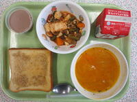 今日はお話給食16日目です。今日のおすすめメニューは、「おばけときつねのじゅつくらべ」にちなんだ「オレンジフレンチトースト」です。バターを入れた牛乳や卵にひたして、オレンジで味を加えました。ミネストローネスープには、じゃがいもやセロリ、トマトなどの野菜をたっぷり入れました。