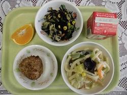 【29日のメニュー】ちゃんぽんうどん 鉄分たっぷりサラダ 焼きおにぎり デコポン 牛乳