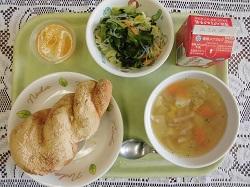 【3月1日のメニュー】きなこ揚げパン 千草和え 白菜とベーコンのスープ サイダーゼリー 牛乳