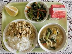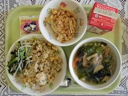 【3月2日のメニュー】ビビンバチャーハン 豆と野菜のチップ はるさめスープ ひなあられ 牛乳