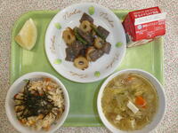 きつねごはんは、甘辛く煮た油揚げと人参と鰹節が入った炊き込みご飯です。ご飯の上に細く切った海苔をのせました。白菜スープは、旬の白菜を入れ柔らかくなるまで煮込んで作ったスープです。木綿豆腐や人参、ベーコンの旨味も合わさったあったかメニューです。仕上げに乾燥パセリを入れました。玉ねぎは隣の畑産、白菜は東部地区産です。