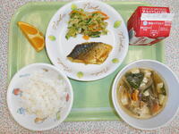 今日のおすすめは、さばのカレーやきです。サバという字は魚へんのとなりに青と書きます。筋肉や体を作るもとになる赤の食品です。カレー味をつけることで、生臭さをやわらげ魚が苦手な子どもたちにも食べやすいように工夫しました。めかぶのスープには、玉ねぎ、人参、豆腐、にらを入れ、めかぶも加えました。めかぶの歯ごたえと少しのぬめりの食感を楽しめる献立です。