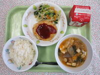 今日のおすすめは、お豆のハンバーグです。ハンバーグを最初に発明したのは、ドイツだそうです。ハンブルクで、硬い肉をひき肉にして焼いたのが、始まりと言われています。野田のお豆腐屋さんの大豆がたっぷり入った、ふわふわハンバーグは、子どもたちに大人気でした。