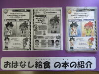 10月は、おはなし給食月間です。毎日、日替わりで「本」にちなんだ献立の給食を提供します。本の紹介も日替わりで先生方が分担します。児童昇降口にその日に紹介した「本」を置いておくと、子どもたちが本を見ていきます。深まる秋の中、「読書の秋」と「食欲の秋」をコラボさせた取り組みです。