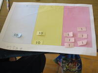 今日の3時間目、2年生算数の研究授業を行いました。単元名は「たし算とひき算のひっ算」です。単元を通して、架空の「福田第三小学校」でいもほりをした想定で、学習を進めています。今日は「129-53」、3位数-2位数(百の位から繰り下がり)の立式をして、答えを求める方法を考える学習でした。半具体物を使いながら、答えを導きだしたり、ひっ算で考えたりしました。