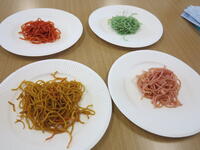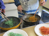 次に、アルカリ性の「かんすい」が入っている麺を使って、カラフルな焼きそばを作りました。