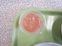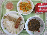 本日のおすすめ献立は、「本に出てくる料理が食べたい券」で1年生が応募した「ルルとララのキラキラゼリー」の本にちなんだ、「キラキラゼリー」です。下はサイダー味、上はマスカット味に工夫され、すっきりとした甘さの可愛いゼリーでした。リクエストした1年生は、初めて放送室に来てマイクに向かいました。はっきりとした元気な声で、上手に本の内容を説明してくれました。家でも作ってみたくなるピンク色のゼリーでした。