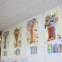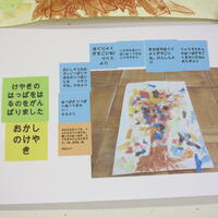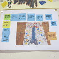 子どもたちは、自分の作品に黄色の付箋に書きこんだ題名を貼り付けます。次に黄緑の付箋に頑張ったことや工夫したことを書き込んで貼り付けます。それが終わると、友だちの絵を自由に鑑賞します。今度は、水色の付箋に友だちの作品を見た感想を書き込んで貼り付けます。友だちの作品の数だけ付箋に感想を書いて貼り付けることになります。オレンジ色の付箋は、教師のコメントです。ICT機器を使っていろいろなことに挑戦しています。