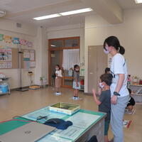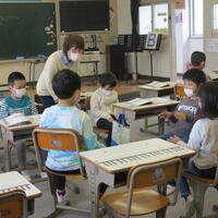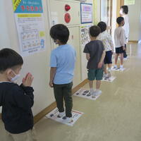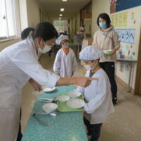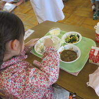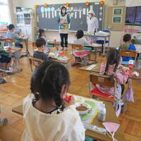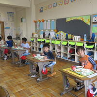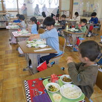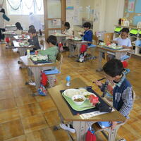 マスクをはずす給食時は、感染症の感染リスクが上がりますので、口を閉じて食べるという約束を守ることが、とても大切になります。どの子もしっかり約束を守って、初めての給食を食べることができました。