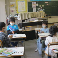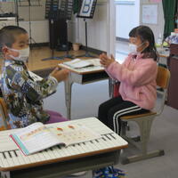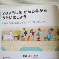 今日は、全学年が時間割に音楽の授業がある曜日です。音楽室からは、ピアノの音や手拍子などが聞こえてきます。「はしの上で」の楽しい曲に合わせた、手拍子が聞こえてきたので、音楽室をのぞいてみると2年生が授業を受けていました。今日は、2拍子のリズム遊びの学習です。最初は2人組で、次は3.4人のグループで、最後は全員で合わせての挑戦です。みんなの気持ちが揃い、2拍子の音楽に合わせた手拍子が上手にできました。