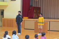 今年度より、児童の自主性やリーダーシップ、表現力の育成のため、全校が集まる場面での高学年の発表機会を増やしています。今日は、「環境・掲示委員会」と「」の委員長より、各委員会の取組と全校児童へのお願いを発表しました。また、計画・放送委員会より「緑の羽募金」への協力についてのお願いがありました。