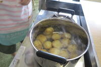 本日、6年生とにじいろ学級のお友だちが合同で、ジャガイモの収穫を行いました。隣の畑の金剛寺さんが畑の先生です。暑い日が続いたので、例年に比べると収穫量は少なめでしたが、土の中を念入りに掘ってたくさん収穫できました。収穫したジャガイモをすぐにゆで、一人ひとつずつ食べました。収穫したてのジャガイモをみんなおいしそうに食べていました。いつもアシストしてくださる畑の先生、金剛寺さん、ありがとうございました。今日の給食の食材のジャガイモも、金剛寺さんの畑(隣の畑)で収穫しました。