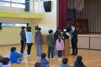 冬休み明け集会は、元気アッププランで歯磨きを頑張った全校の子どもたちへの表彰から始まりました。学級の代表が賞状を受けとりました。また、今年、頑張ることを2.4.6年生の代表が発表しました。校長からは、今年はうさぎ年、うさぎのように飛躍できるように頑張ることについてと、夢や目標を持って準備することを大切にという二つの話がありました。体育健康委員会委員長が縄跳びの技の披露をしてくれました。その見事な技が下級生の縄跳び記録会への準備の動機付になりました。保護者の皆様、地域の皆様、今年もどうぞよろしくお願い致します。
