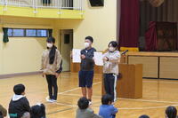 「本校児童は人前で自信を持って表現することが苦手」という昨年度の課題解決のため、今年度は、児童が集会の司会進行を務めるという手立てを講じてきました。はじめは、恥ずかしそうにしていた計画放送委員会の児童ですが、だんだんと態度や声に自信がつき堂々としてきました。成長している姿を見て嬉しくなりました。