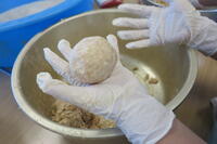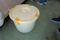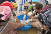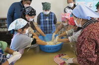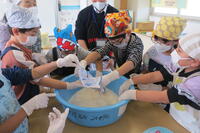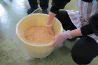 はじめに、水につけていた大豆の水を切り、圧力釜の中に入れて煮ます。つぎに、塩と麹を混ぜ合わせ塩麴を作ります。それから、圧力なべで煮た大豆を釜から出し、うちわで冷まします。冷ました大豆を手でつぶし、そこに塩麴を混ぜ合わせ団子にします。団子にした味噌だまを空気を抜くために樽の中に投げ入れます。入れた味噌だまを平らにならし、塩をふりかけ密閉します。樽をビニルで覆って、来年まで寝かせます。講師の先生と保護者の皆さんのおかげで、無事、味噌の仕込みができました。初めて体験する子が多く、みんな興味津々に取り組んでいました。味噌が出来上がる来年が待ち遠しいです。