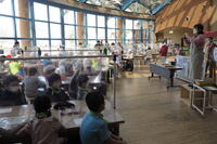 本日、6年生が、野田市農政課の講師の先生1名、地域の講師の先生3名をお招きして、郷土料理の「太巻き祭り寿司」づくりに親子で挑戦しました。卒業を間近に控えた6年生が、小学校での思い出づくりも兼ねた「太巻き祭り寿司」づくりです。「切ってみるまでどんな模様になっているかドキドキする」、そんなスリル満点な太巻き作りでした。講師の先生が実演してくださったときは、出てきたすてきな模様に歓声が上がりました。子どもたちにとっては、初めての経験で、難しい作業でしたが、講師の先生方の丁寧なご指導のおかげで、バラとカタツムリの模様の太巻きが完成しました。どのグループも味のある世界で一つだけの「太巻き祭り寿司」が完成しました。ある児童は、親と子の共同作業がとても楽しかったと言っていました。