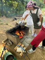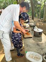 練習は家庭科室で行い、ご飯は給食のご飯を利用したので飯盒による炊飯は初めての体験です。(次年度は事前にかまどを設定しての事前練習を行います!!)野菜を切り、米を研ぎ、水の分量等を量って下準備をした後に飯盒と鍋をかまどに設置し、薪を使っての調理を楽しみました。初めはおっかなびっくりの様子でしたが、徐々に慣れて最後には笑顔あふれる調理体験となりました。応援に来てくださった木下先生を交えて、みんなで美味しくいただきました。