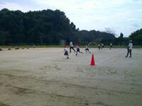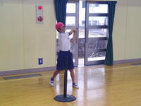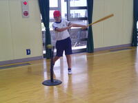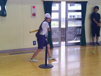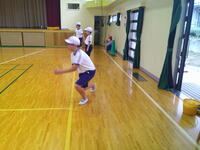 今日が第1回目で、雨天のため体育館で行いましたが、ゲームのルールを確認しながら練習に取り組んでいました。通常の野球のルールとは異なり、攻撃側はティー上のボールを打ってからバットを次の打者に渡した後、ベース代わりのコーンまで走り売った地点まで往復します。コーンは3つ置かれており、近いところは1点、中間が2点、遠いところが3点となっています。守備側は、ボールを取った選手の近くに全員が集まり、座った時点でアウトが確定します。(他にも縦一列で並んで座るパターンと、二人がフラフープの中に入るパターンがあるとのこと)今日は体育館だったので、1往復する前にアウトになるパターンが多かったのですが、広い校庭で実施したら得点を防ぐことはかなり難しそうです。