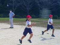 5・6年生が体育でベースボール型のゲーム(ティーボール)を行っていました。