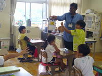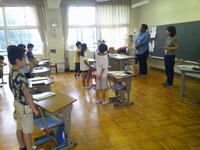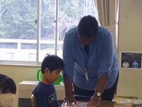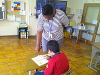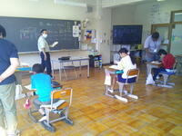 5年生が英語活動の学習に取り組んでいました。今日は、様々な単語を発音する学習を行っていましたが、カタカナ英語ではなく、正しい発音をすることは難しいようです。5年担当の武井先生、ALTのメルスィ先生、支援員の長田先生と3人の指導者で3人の子どもたちの学習活動を支援するというまさに本校ならではの少人数指導が行われていました。