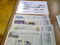 さて、福田二小の図書室を「優良図書室」として認定していただくこともねらいの一つとして、図書室に「新聞コーナー」を新たに設置しました。本来のねらいは、社会の様々な出来事や記者の思い等を新聞から読み取り、自分なりの考えを持つこと(本当は、発表したりまとめたりさせたい・・・NIE教育)ですが、まずは新聞に触れるところからがスタートラインでしょうか。新聞は千葉日報なので、普通に家庭で購読している新聞やTV・インターネット等にも触れられていない千葉県の情報(ニュース・事件・地域の話題・地域スポーツの結果等)を知ることもできます。