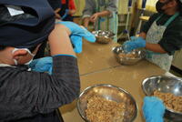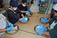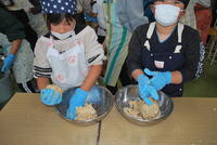 3年生が、味噌作りに挑戦しました。昨日から水に漬けておいた大豆を圧力鍋で煮て(この工程は講師の方にお任せでした)ミキサーを使って煮上げた豆をすりつぶし、塩と麹を混ぜ込みます。団子状に丸めた「味噌玉」を仕込み樽に押し込むようにして詰めていきます。空気に触れないよう(酸化防止と防カビ)塩で覆いをした後で、ふたをして重しを乗せたら、仕込みは完了です。冷暗所で保存し、来年11月下旬頃天地返しを行います。実際に「味噌」が完成してご家庭で味わえるようになるのは、再来年の2月初旬頃でしょうか。