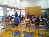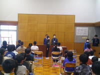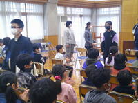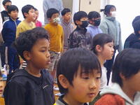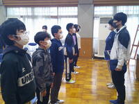 当日も司会を担当する教務主任の清水先生の進行で入場から退場までの式の流れと、立つ・座るの動作の確認をしました。低学年の子どもたちには、難しいようです。明日の予行で、どこまで上手にできるでしょうか。