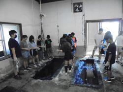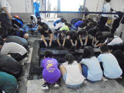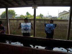 中島紺屋では、藍染め体験を行いました。輪ゴムの縛り方により様々な模様に染め上がり、素敵なハンカチができました。最初のうちは洗濯すると色落ちして、他のものに色移りするそうですので、2回ぐらいはハンカチだけで洗濯してください。