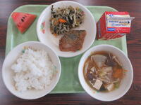 今日の献立はご飯、牛乳、鯖のスタミナ焼き、切り干し大根ののりごま和え、のっぺい汁、スイカでした。