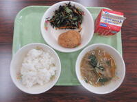 今日の献立は、発芽玄米ご飯、手作りふりかけ、牛乳、味のネギ味噌焼き、かみかみおひたし、たぬき汁でした。