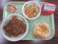今日の給食はジャージャー麺、牛乳、キャベツのピリ辛和え、ころころチーズパン、カリカリナッツでした。