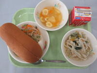 今日の献立は、きなこ揚げパン、牛乳、焼き肉サラダ、実だくさんスープ、のり塩ナッツでした。今日は、二ツ塚小で大人気のきなこの揚げパンです。きなこは、いった大豆をひいて粉にしたものです。大豆にはタンパク質以外にもたくさんの栄養が含まれていてイソフラボンには、骨を強くする働きがあります。成長期に皆さんにとってほしい食品です。