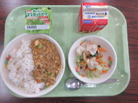 今日の献立はご飯、牛乳、エビと豆腐のチリソース煮、冬瓜のスープでした。