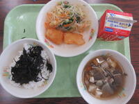 今日の献立はご飯、牛乳、赤魚のスタミナ焼き、磯か和え、かき玉汁でした。
