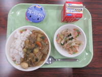 今日の献立は、麦ご飯、牛乳、ポークカレー、大根サラダ、ブルーベリーゼリーでした。
