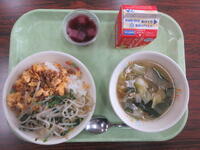 今日の献立はビビンバ、牛乳、白玉入り中華スープ、手作りぶどうゼリーでした。ビビンバは韓国料理の一つで「混ぜご飯」という意味です。ご飯の上にもやし、ひき肉、錦糸卵などのいろいろな具材を盛り付けて、、混ぜて食べます。肉と野菜を同時にたくさんとれる料理です。