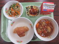 今日の給食は焼きたてクロワッサン、牛乳、おからのキッシュ、じゃこ昆布サラダでした。おからは、豆腐を作るときに煮た大豆から豆乳を搾り取った後の残った部分です。おからは、大豆と同じタンパク質や食物繊維などの栄養が豊富です。タンパク質は成長期の体を作ることに、食物繊維は便秘の予防に役立ちます。