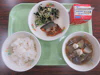 今日の献立は、ご飯、牛乳、鯖のピリ辛焼き、磯香和え、けんちん汁でした。5月10日は、ごぼうの日。5が「ご」、1が棒「ぼう」0が「お」でごぼうの日。ごぼうは土の中の根っこを食べる根菜です。食物繊維が豊富で便秘の予防に役立ちます。また、皮に香りやうま味、栄養も含まれているので、皮はむかず軽くこするぐらいで食べましょう。