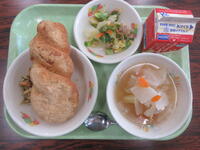 今日の献立は、きなこ揚げパン、牛乳、焼き肉サラダ、実だくさんスープ、のり塩ナッツでした。今日は、二ツ塚小で大人気のきなこの揚げパンです。きなこは、いった大豆をひいて粉にしたものです。大豆にはタンパク質以外にもたくさんの栄養が含まれていてイソフラボンには、骨を強くする働きがあります。成長期に皆さんにとってほしい食品です。