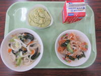 今日の献立は、ちゃんぽんうどん、牛乳、大根サラダ、サツマイモと抹茶のケーキでした。5月1日は、「八十八夜」というお茶の新芽を摘み始める時期です。抹茶は、茶葉を日光に当てずに育て、茶葉をもんで作る緑茶とは違い、もまずに乾燥させて作る食材です。抹茶には、風邪の予防につながるカテキンという栄養も入っています。