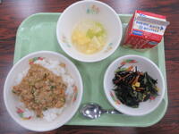 今日の献立は、ご飯、牛乳、肉味噌丼、ひじきの梅ドレッシング、フルーツポンチです。ひじきは、海でとれる海藻です。ビタミンやミネラル、食物繊維が豊富な食材で、骨や歯を強くしてくれます。ひじきは、鉄分が多いとされていますが、加工する鍋によって大きく違います。鉄の鍋で加工すると鉄をより多く含むことができます。