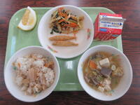 今日の献立は、たけのこご飯、牛乳、きびなごのカリカリフライ、和風フレンチサラダ、豚汁でした。たけのこは、春が旬です。漢字で「筍」と書きます。旬の字には、十日で一巡りの意味があり、たけのこは、芽を出してから一旬(十日)くらいで竹になってしまうことからきています。春の恵みをおいしくいただきましょう。