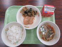 今日の献立はご飯、牛乳、鶏肉味噌焼き、切り干し大根ののりごま和え、田舎汁でした。田舎汁は、にんじん、小松菜、えのき、ねぎ、豆腐、油揚げがはいり、具だくさんです。汁には、野菜のうま味や、栄養素が溶け出しています。汁まできれいに飲めるといいですね。