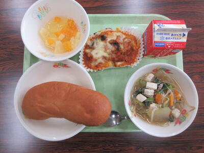今日の献立はコッペパン、牛乳、なすのミートグラタン、なすのミートグラタン、冬瓜のスープ、フルーツポンチでした。