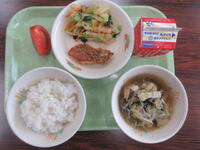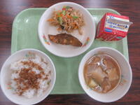 今日の献立はご飯、牛乳、赤魚のピリ辛焼き、じゃこと小松菜のナムル、田舎汁、トマトでした。