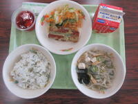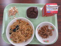 今日の献立は、豚キムチ焼きそば、牛乳、大豆とじゃこの甘辛いため、米粉のココア蒸しパン、カリカリナッツでした。