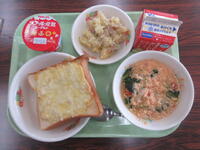 今日の献立はチーズのせパン、牛乳、ジャーマンポテト、トマトと卵のスープ、ヨーグルトでした。